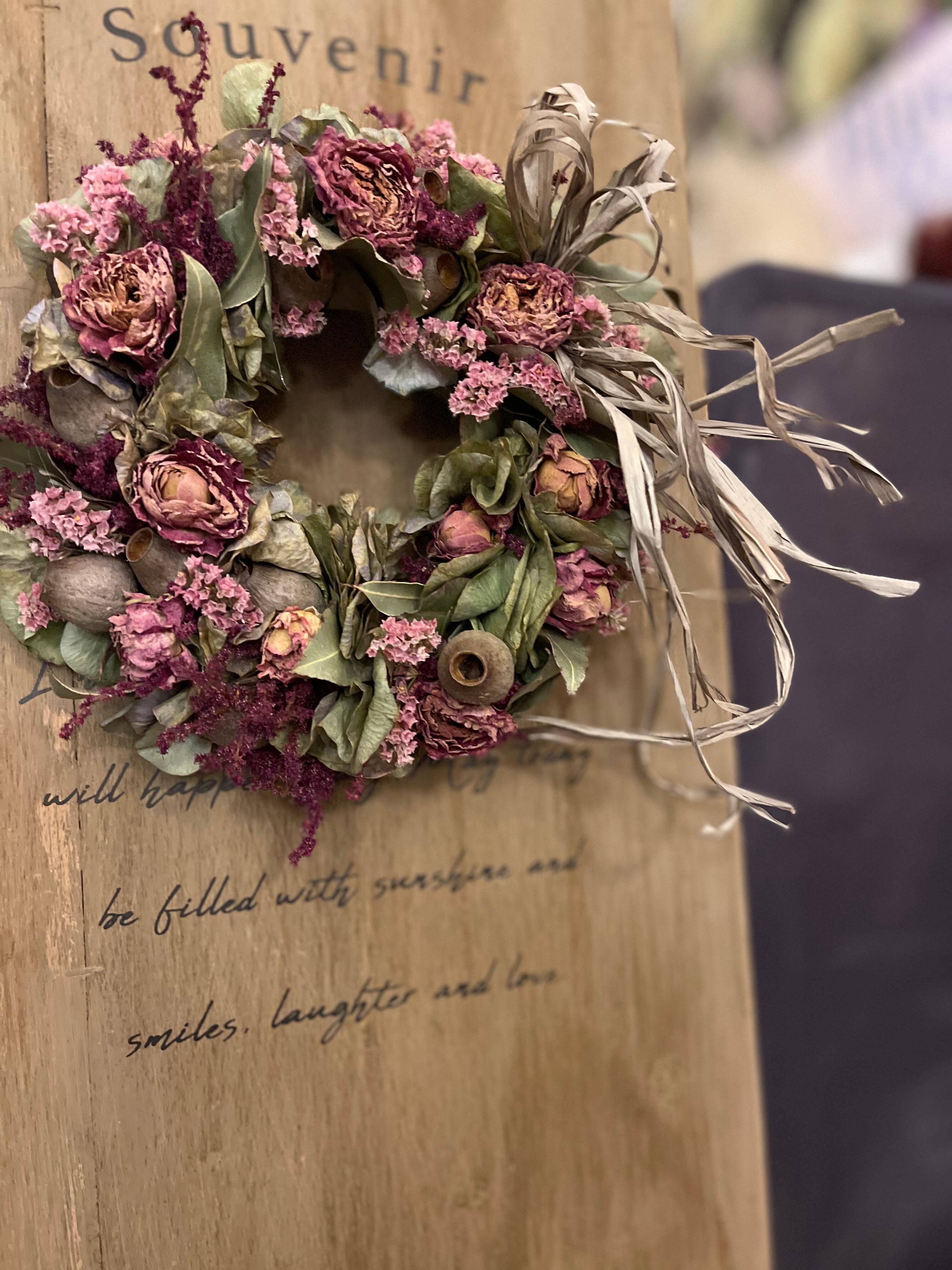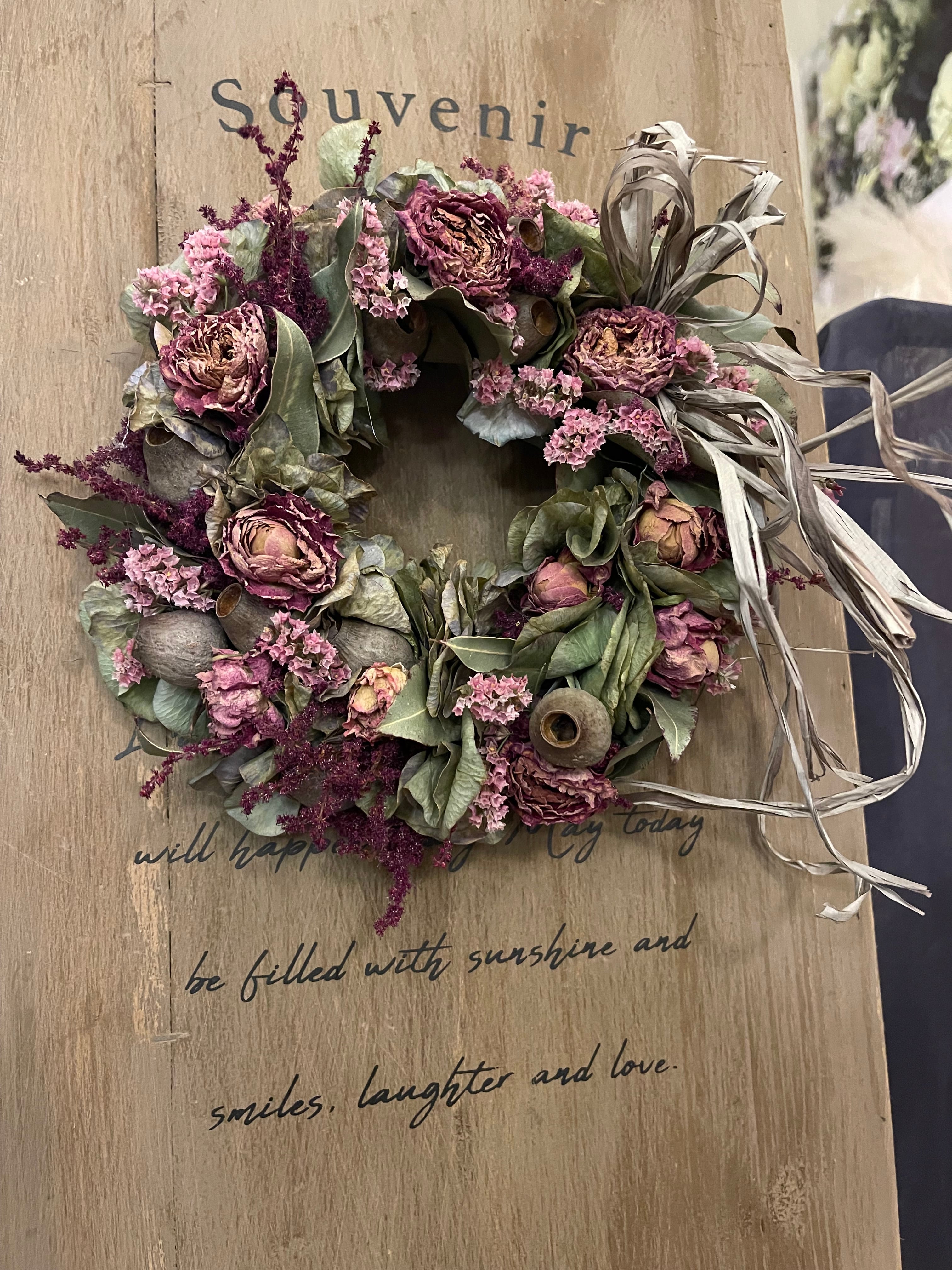 アンティーク色紫陽花とバラのリースは、美しくドライになった花材の高級感が魅力。